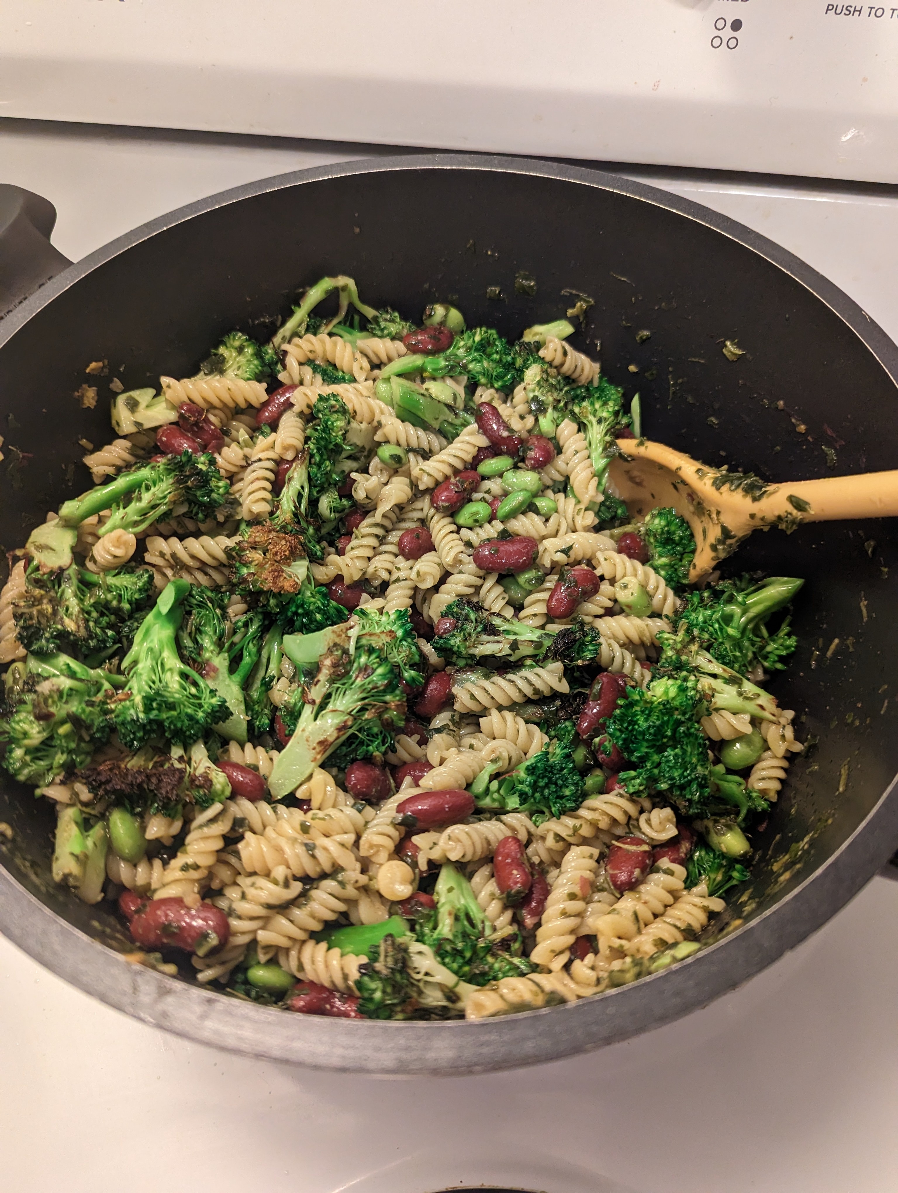 Very quick and simple pesto pasta, perfect for meal prep. Prep time Total time 15m 20m Ingredients Ingredient Quantity pasta 8 onces (225g) olive oil 2 Tbsp. peanut oil 2 Tbsp. nutritional yeast 3 Tbsp. garlic, minced 3 cloves kidney beans 15oz can frozen edamame 2 cups broccoli florets 2 small crowns arugula or basil pesto 1 store-bought package Directions Cook pasta al dente, according to package instructions Stir-fry brocoli and edamame in wok with peanut oil, add garlic and cook for about 30 seconds Combine pasta, veggies, nutritional yeast, beans, pesto and olive oil in large pot....